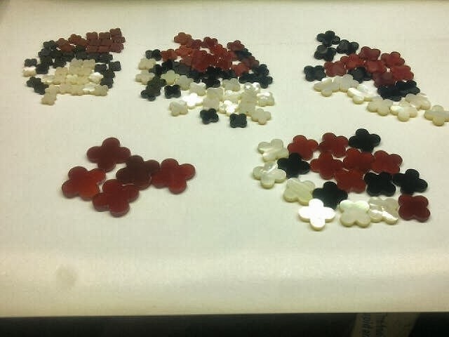 top 10 stones we have made from this clover shape is Black onyx, black agate, red agate, MOP, tiger’s eye, white shell, lapis, sodalite, rhodonite, green jade,