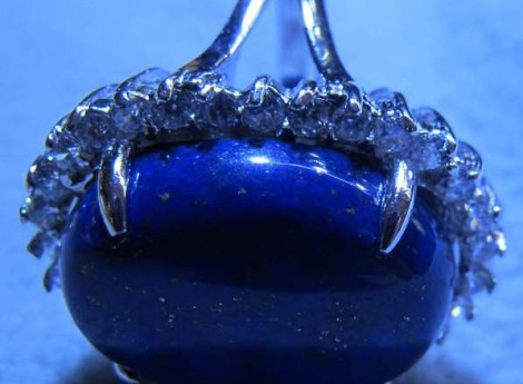 925 Sterling Silver Ring, Rhodium Plated, setting with 25*18 mm Lapis Lazuli Oval Calibrated Cabochon. Lapis Lazuli is a blue color gemstone from Afhanistan. There are small white cubic zirconia, which is imitation diamond.